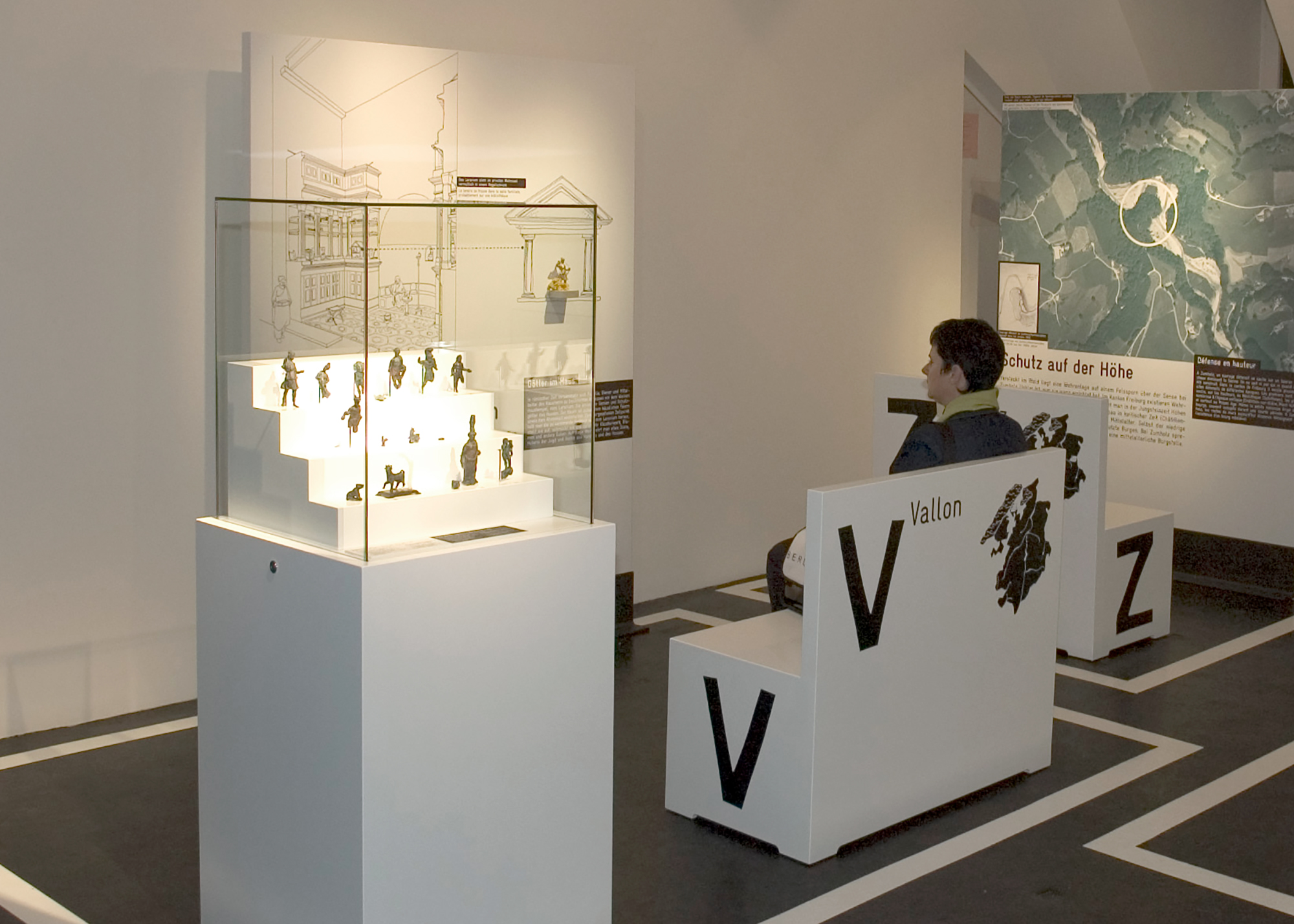 Aménagement d’un parcours dans les escaliers et couloirs du service archéologique du canton de Fribourg. Une balade à travers les étages pour présenter les objets archéologiques découverts dans les différentes communes du canton.