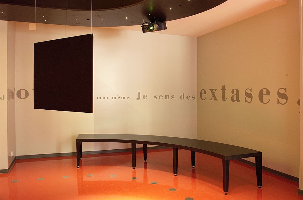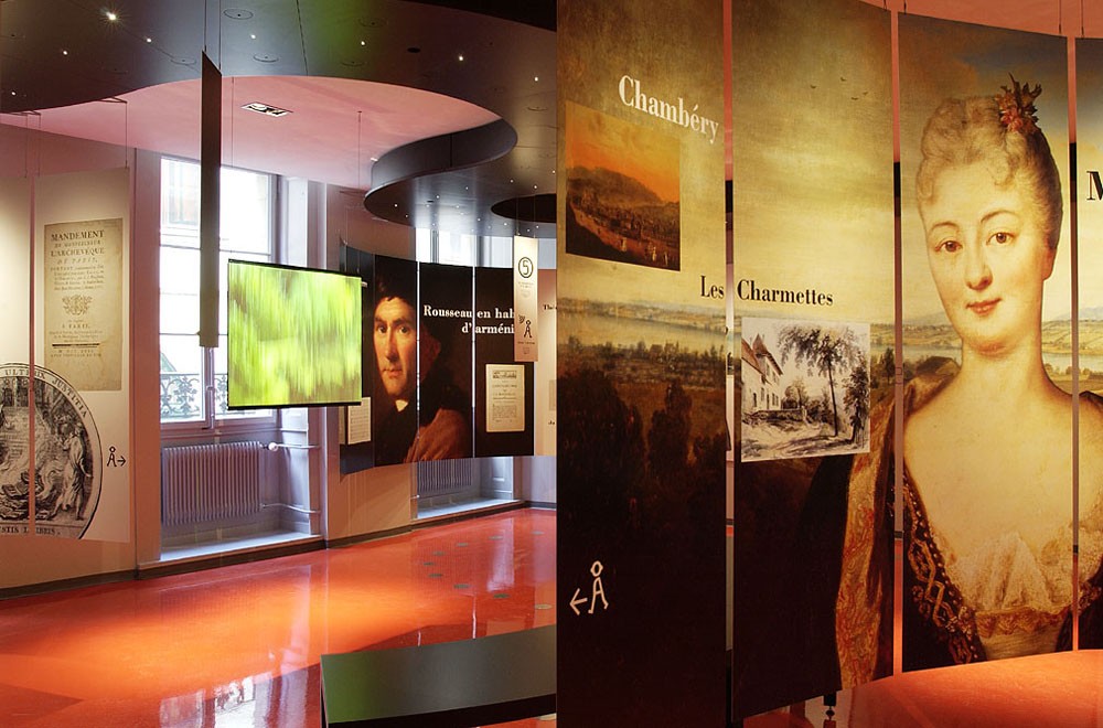Imaginer, par un travail de scénographie et de graphisme, une promenade qui donne envie au visiteur d’en savoir plus. Présenter et transmettre une information de manière attractive sur une surface de 110 m2. Un chemin, une balade au cours de laquelle Jean-Jacques Rousseau parle à l’oreille du visiteur.
