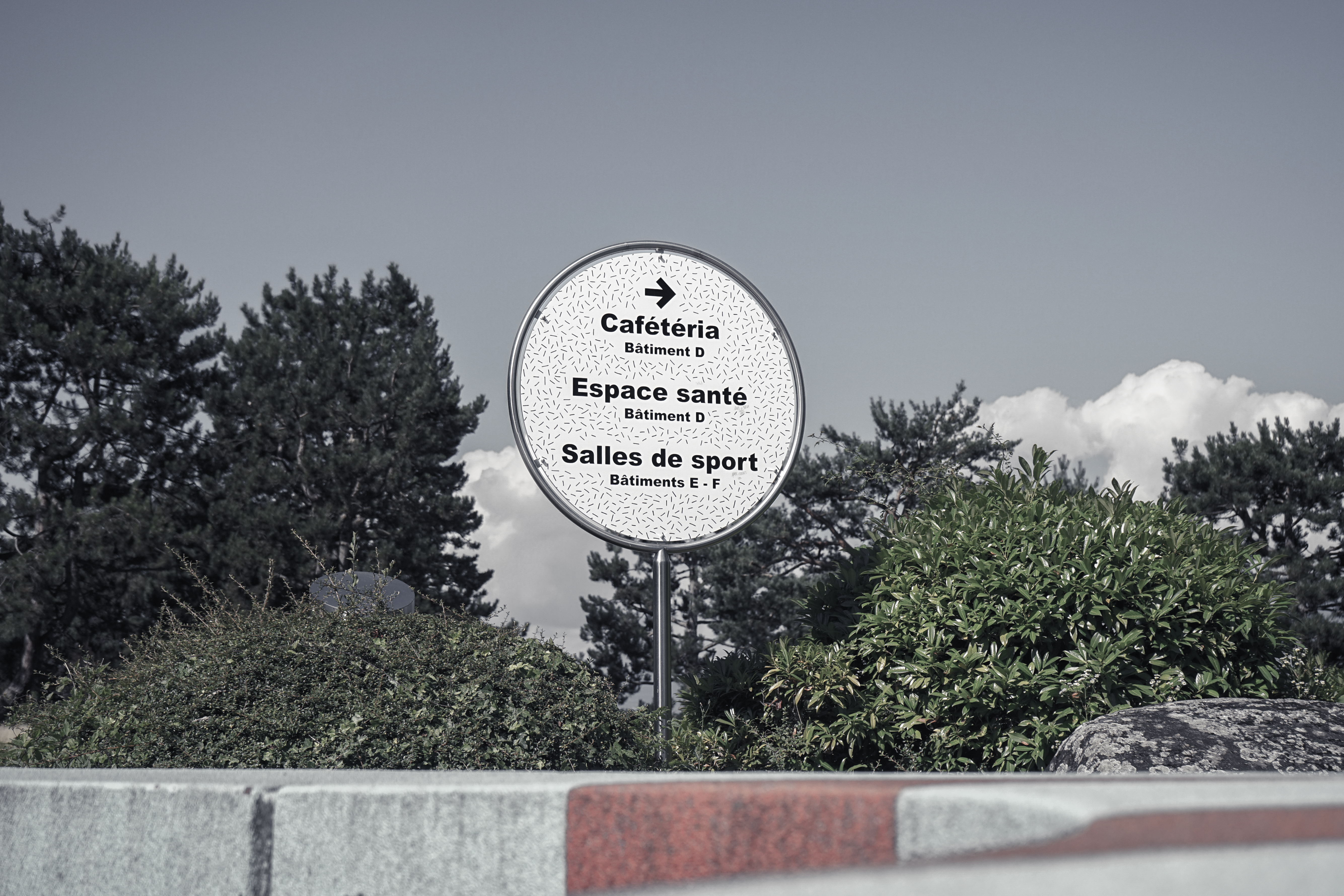 Trames manuelles, ronds, noir-blanc... comme une seconde peau, une signalétique qui fait le lien entre les différents bâtiments du gymnase.