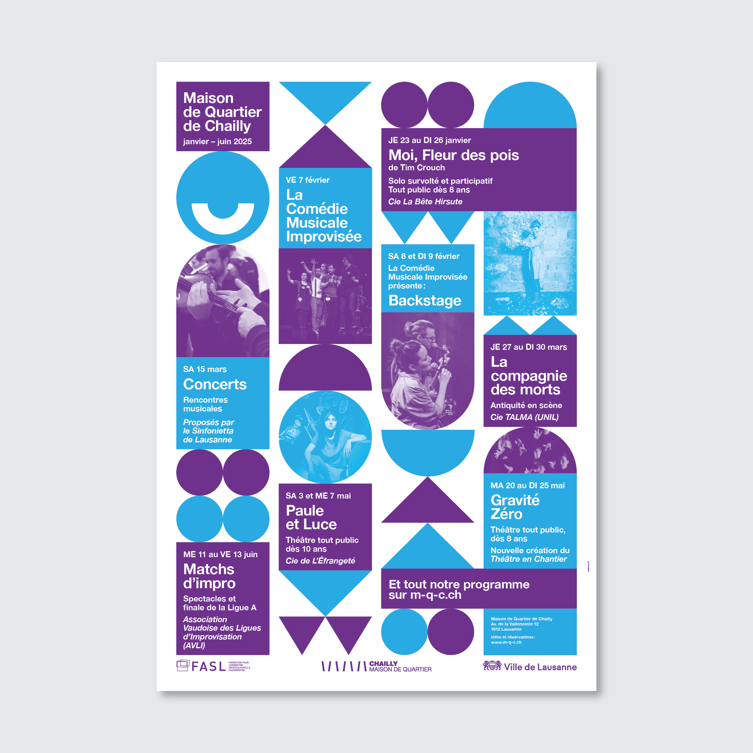 Ronds, carrés, triangles s'assemblent, s'associent, se combinent pour former l’univers graphique de la Maison de Quartier de Chailly.