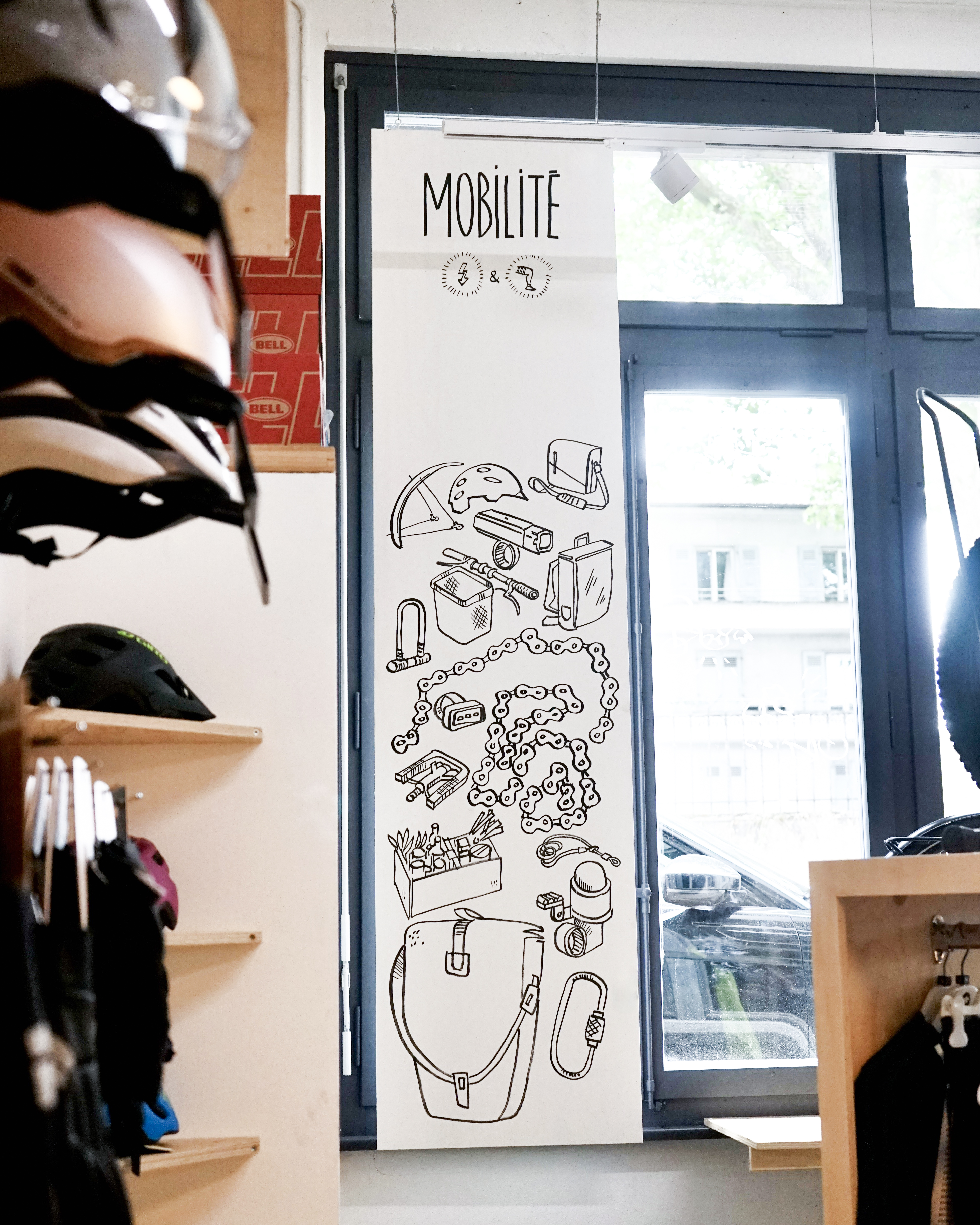 Habillage des murs des nouveaux locaux de Version Originale Cycles, magasin de vélos en tout genre. La diversité se lit sur les murs au trait noir, brut réalisé in situ. Cyclistes 1:1, chaînes, pédaliers et roues se côtoient joyeusement.